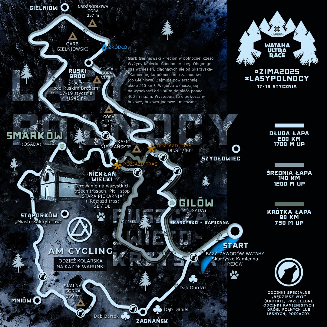 Zapraszamy do Krainy Watahy. Na zimowy szlak leśnych duktów Dawnej Wielkiej Puszczy Świętokrzyskiej. Zimowy maraton ultra-extreme poprowadzi Was północnymi lasami Ziemi Świętokrzyskiej, pociętymi gravelową trasą, stworzoną, aby cieszyć się zimowym kolarstwem i surowym pięknem przyrody. Leśne drogi pnące się ku Garbowi Gielniowskiemu prowadzą w bukowo-jodłowe, północne rubieże Puszczy.